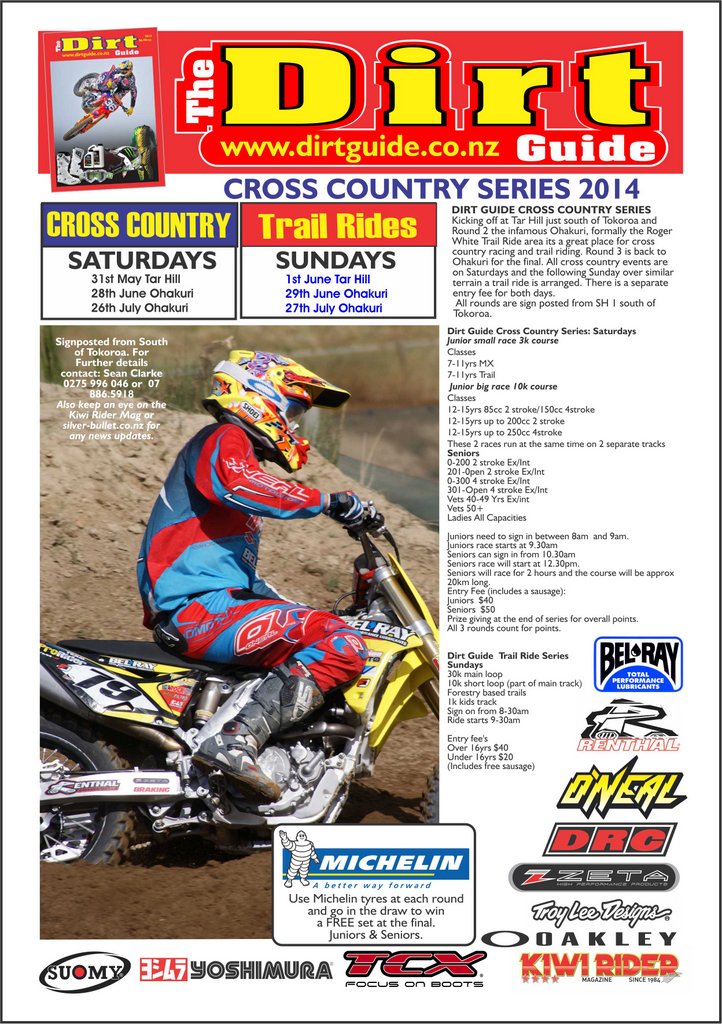 Due to the fact that the first round of the Dirt Guide Cross Country series is clashing with the NZ Cross Country championships next weekend Sean has decided to postpone round 1 until 2 weeks later and have it on the 31st May/1st June. This means Round 2 will be on the 28th and 29th June and then Round 3 will be at the end of July on the 26th and 27th of July.