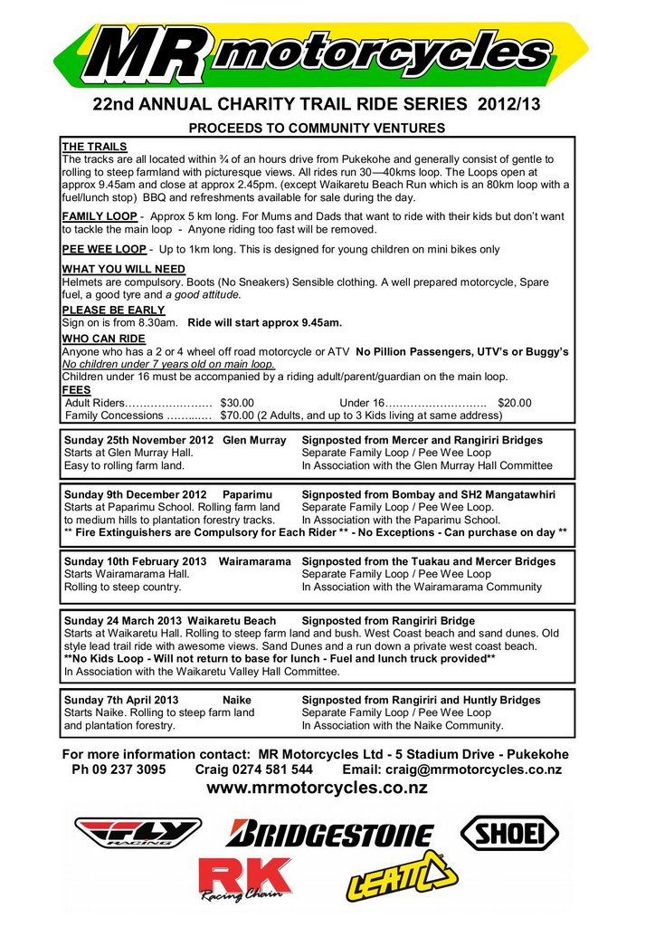 MR Motorcycles Charity Trail Ride series now takes on its 22nd year of raising money for the Franklin and North Waikato Communities.