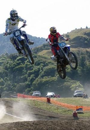 Photo - The Yamaha pair, Wellington's Jayden Jessup (#4) and Paraparaumu's Jesse Donnelly (#2) battle in the air space of Woodville
