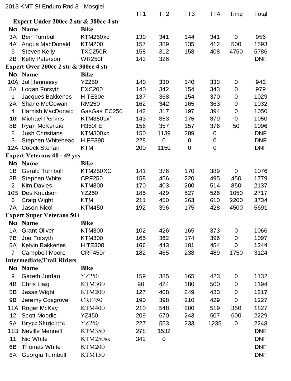 2013 KTM SI Enduro Rnd 3, RESULTS