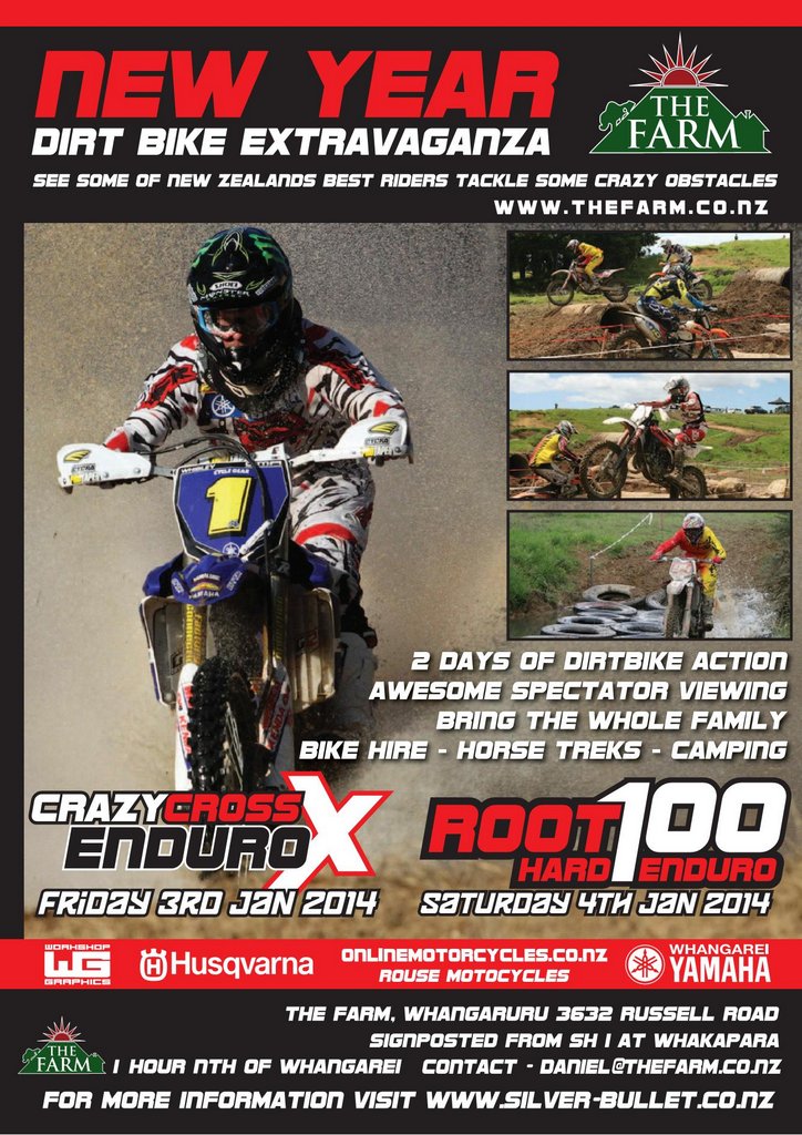 On Friday the 3th Jan is the Crazy Cross, a mix of Moto Cross, Enduro Cross and Cross country. This is a fun event designed to give riders a variety of different riding, and spectators some entertainment. Set in a natural basin, it offers a multitude of prime spectator vantage points. This is a perfect opportunity to get some practice for the Te Puke Enduro X or to just have a fun day out on your motorcycle. (For more info click here)