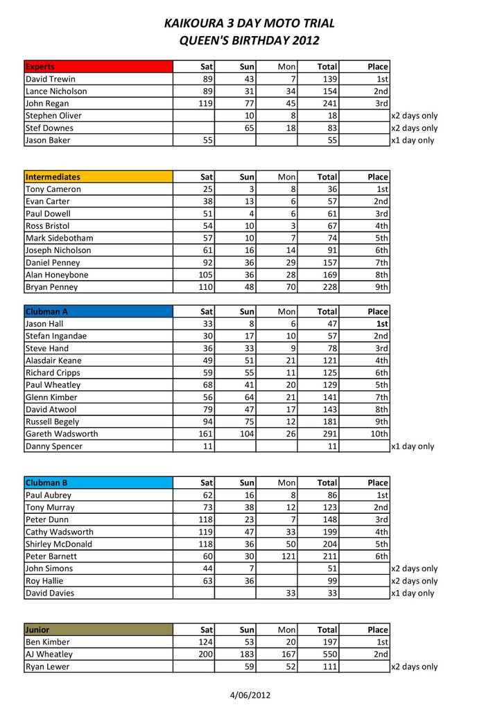 Kaikoura 3 Day Trial RESULTS